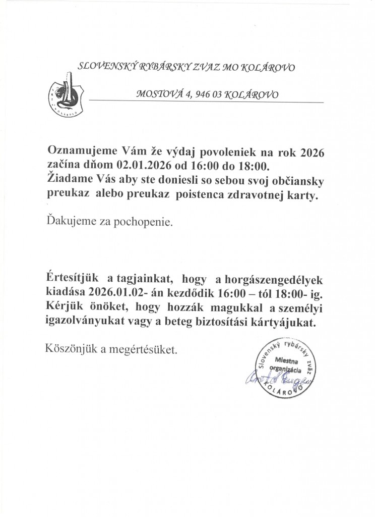 A Szlovák Horgász Szövetség Gútai Alapszerverete ezúton értesíti a tagokat, hogy a iroda az alábbi nyitvatartás szerint fog működni 2026. január 2-től: