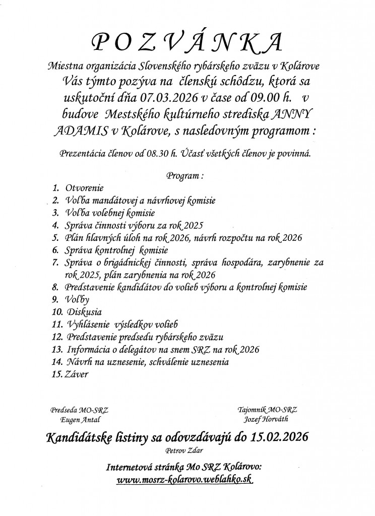 Vážené rybárky, rybári a členovia MO SRZ Kolárovo,